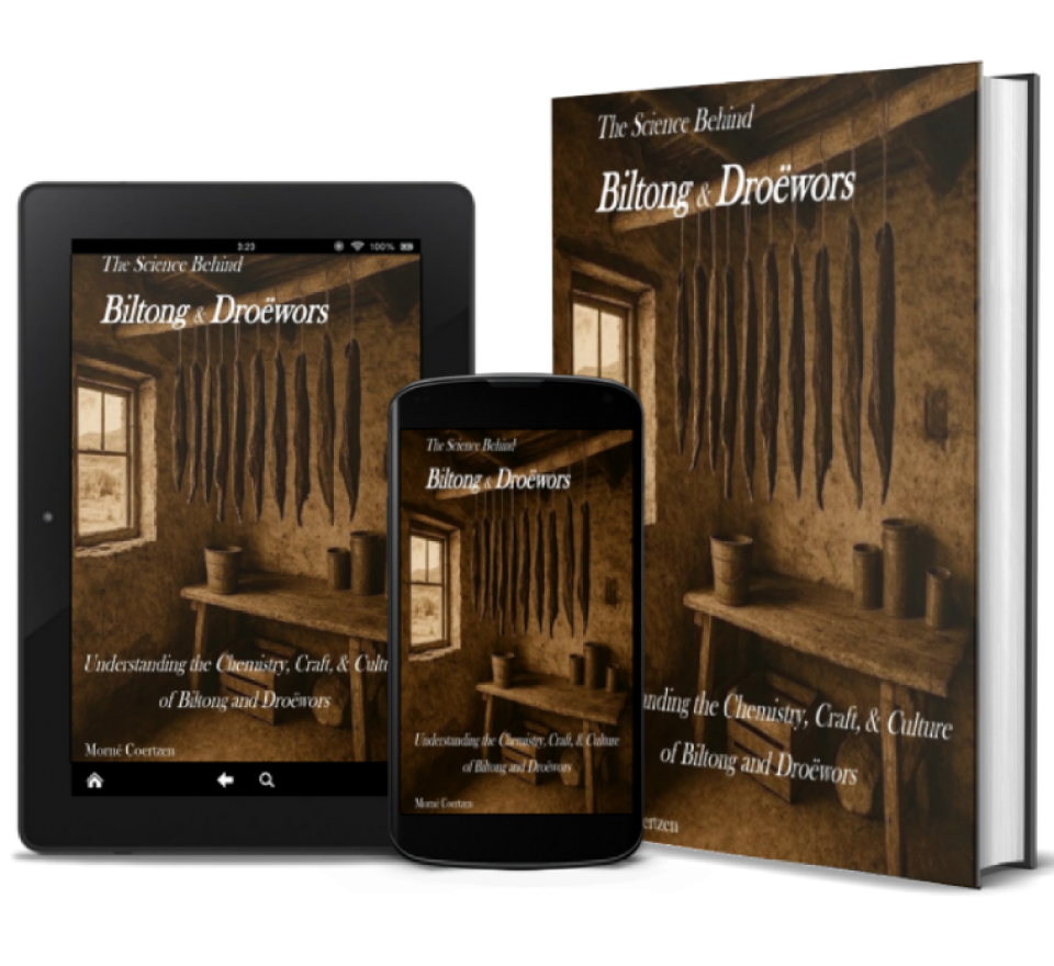 (The book explains the exact ratios, casing behaviour, and how to prevent hollow droëwors.)