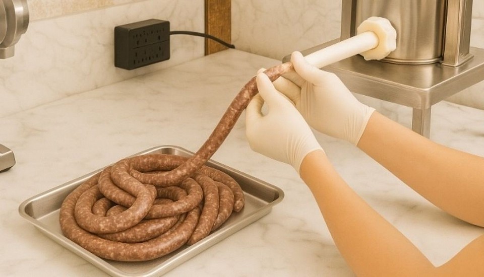 Once seasoned, the meat is gently stuffed into the casings. Traditional makers avoid over‑packing the sausage, as tight stuffing prevents airflow and leads to uneven drying.